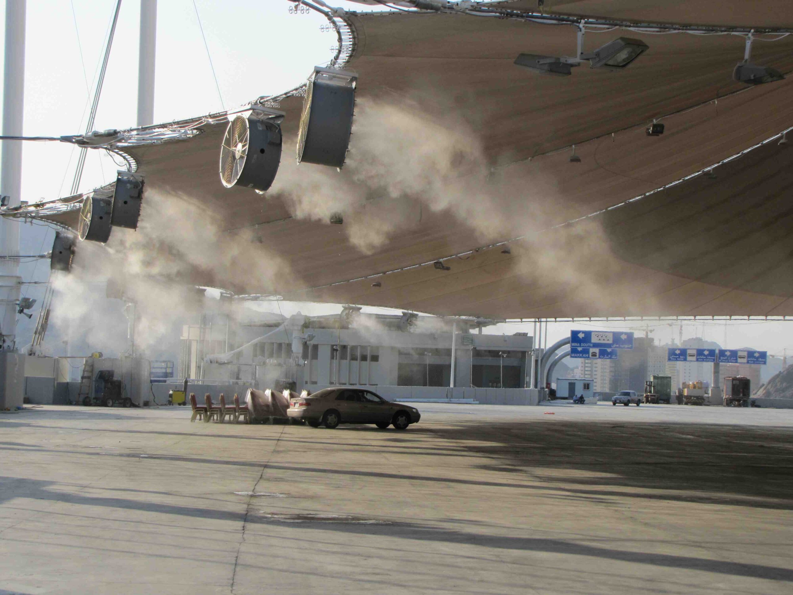 Cloudburst Misting Systems, Inc. working with their Authorized Dealer in Saudi Arabia “Art Contracting Co. Ltd.” designed, built and installed a new mist cooling system for the new multi billion-dollar remodel project in Saudi Arabia. The system included 90 custom designed high-velocity fans that used 24 nozzle tri concentric mist rings all powered by four 30 gallon GPM custom pump skids with integrated controls. The project used the misting system to create a much safer and more comfortable environment for the 3 million plus people that attend the Hajj every year. The misting fans were all custom designed to throw a cooling mist an unprecedented 180 feet each while keeping the noise level below 66 dB.